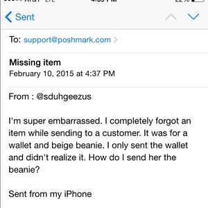 @lorab43 I'm so embarrassed! I just checked and it's still in my closet. I don't know what I was thinking. I am emailing posh support as we speak to see what I can do to get it out to you. Again I am so sorry!