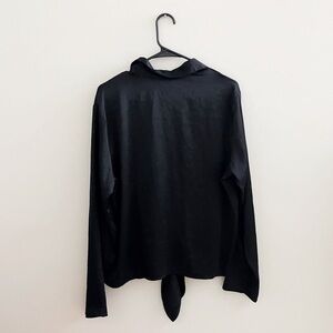 Size XL black sateen tie front blouse. The measurements are a 44 inch bust, 21 to 24 inches in length, 28 inch long sleeves, 42 inches across the mid section and 46 inches across the bottom of the blouse.