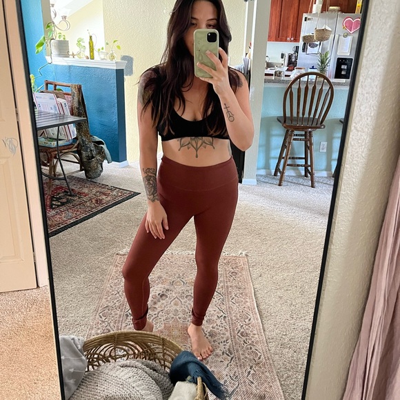 Fabletics ribbed mid rise rust colored leggings. Super comfy and a thicker feel. Modeled on waist size 29.