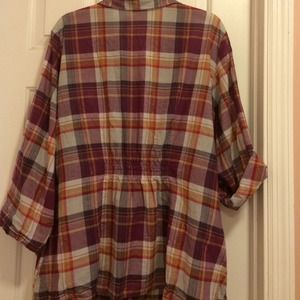 This shirt has different shades of purple in it. The sleeves can be worn down or button up and the back has a gathering to make it more fitting
