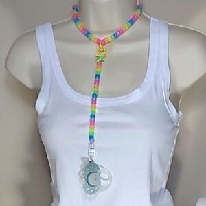 All my items are crafted with white or color stretchy cord for comfort. All ends are square knot for best hold.. All earrings are stainless steel hooks with 30mm stars. Most beads are either glow in the dark or silicon. All binky cords are removable from choker by either a stainless steel carabiner or lobster claw.