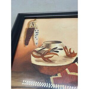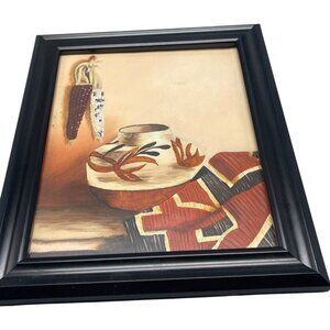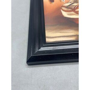 Southwestern black framed wall art featuring an orange corn basket by S. Brooks. Perfect for adding a touch of rustic charm to any space. Used condition, see photos for details.