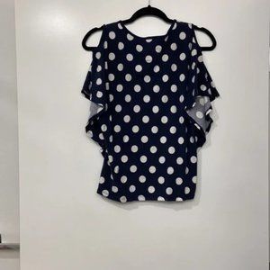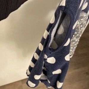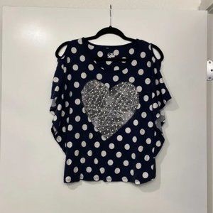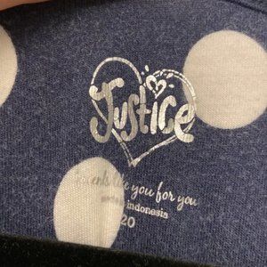 Used good condition Girls size 20 from justice Blue and white polka dot shirt with peephole sleeves and sparkly silver heart