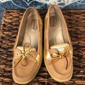 Tan sperrys. Gold strings. Worn once but look BRAND NEW. memory foam bottoms. Super comfortable!