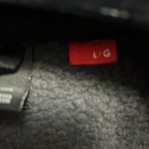 Size large. Core sweater. Gray and black with fleece lined inside. Full zip and two zippered pockets. Medium weight jacket. Very good used condition.