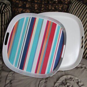 square melamine serving trays one solid white new with tag one striped colors new without tag both have white backs identical style and size different maker stamps 14 x 14 inches perfect condition offering separately - message for offer on both