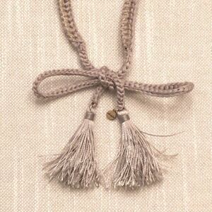Samar Fringe Necklace. Taupe Fringe with Gold Coin Accents. Braided Cord Necklace with Gold Thread Accents.
