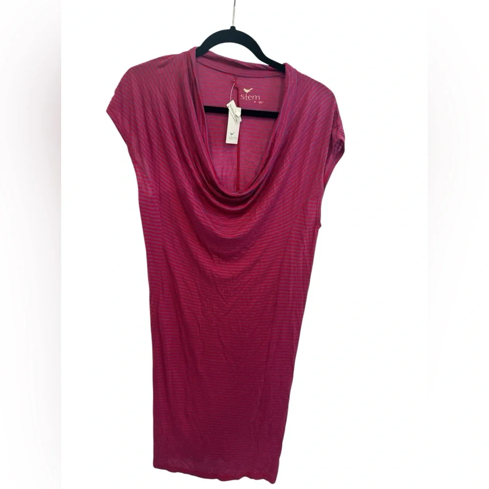 Raspberry short-sleeve mini dress by stem. Draped cowl neckline for soft shape. Fitted silhouette with subtle stripe texture. Lightweight knit ideal for layering or solo wear.