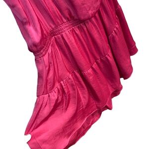 Time to let your shoulders out. The On Pointe dress is an asymmetrical, one-shoulder washed satin mini with a fitted waist and ruffle trim hem.