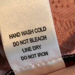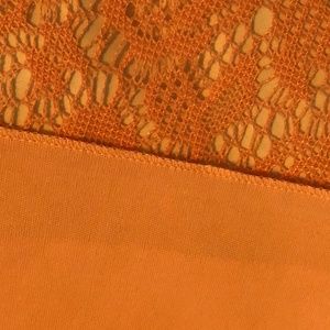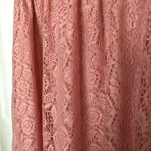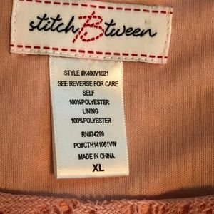 stitchBtween Sleeveless Salmon Color Crochet Dress with Lining, Angled Hem, Round Neck and Elastic Waist.  Measurements taken flat.  Measurements are approximate:  Armpit to Armpit 21", Waist 14 1/2", Armpit to Right Hem 34", Armpit to Left Hem 28 1/4".  Crochet Dress goes beyond Lining 1" on Left and 6" on right.  100% Polyester, 100% Polyester Lining.  Gently Used.  Women's Size Extra Large. (INV145)