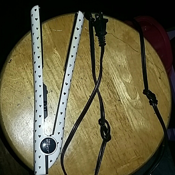 its white with black little hearts. its in perfect condition i bought it about one week ago but i have so many of them i dont need that one. But its perfect for thick and thin hair and it dose not burn your hair or anything.