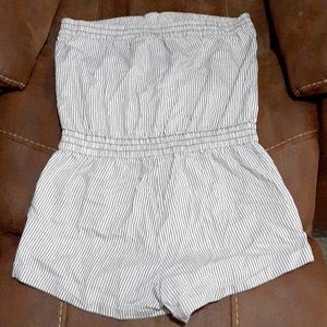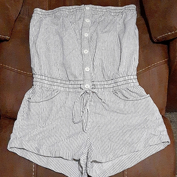 cute strapless navy blue and white striped romper with buttons up the front. excellent condition. no stains or rips. size medium.