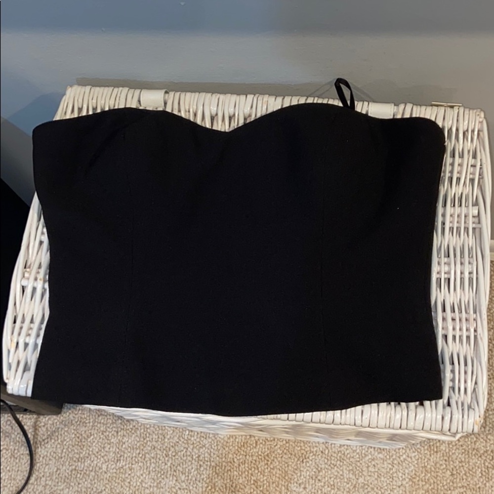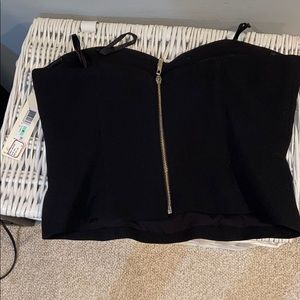 very cute black strapless top. tags still on, never worn, no stains in perfect condition. super cute gold zipper on the back and cup like front for perfect fit. size 8 from eliza J