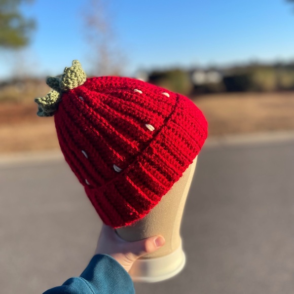 this is an adult sized strawberry themed beanie that I've made. it's a perfect pop of color and crochet beanies are super warm and soft!