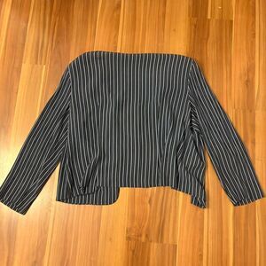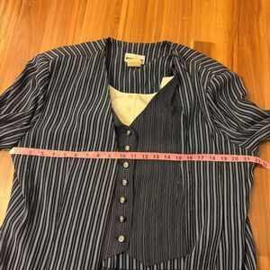 blue pinstripe, layered design, detachable collar, vintage blouse, 80s style, structured fit, formal wear, retro, versatile top, fitted