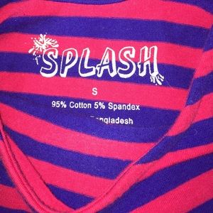 this shirt is so cute i used to love it!! it doesnt really fit anymore and it makes me sad seeing it in my closet so i think its time to get it a new owner! scoop neck, 3/4 sleeve, fitted pinkish red and navy blue striped shirt. its not cropped and i think i got it from burlington coat factory