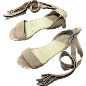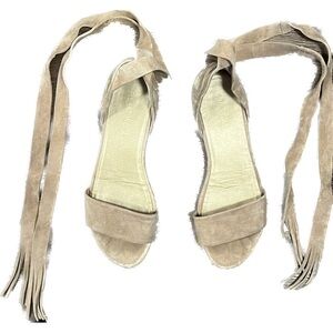 Suede sandal with ankle-wrap tie closure featuring fringe ends