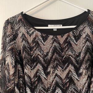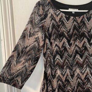 studio one new york lined earth tone chevron 3/4 sleeve dress & attached sash 12. Classic sheath dress with lined sash that’s strategically longer on one side than the other to always make a nice, easy tie in front or back. About 18.5 inches from under one arm to the other. About 38 inches from shoulder seam to hem. Beautiful and understated dress. Excellent used condition. Bundle with more items from my closet to save.