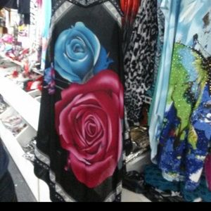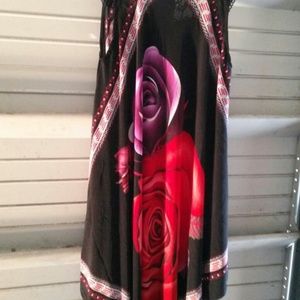 A lace neck dress with a beautiful red/blue rose print on the front Vshape at the bottom with a very soft feel on the body. Other sizes Large and XL