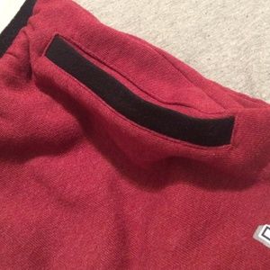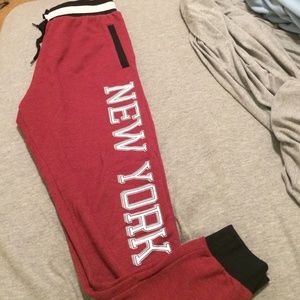 deep red/burgundy. has pockets and drawstring. size small from forever 21. I cut the tags off due to them being itchy. I wore once and then they shrunk in the dryer (I have super long legs)
