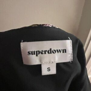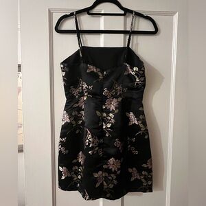 Superdown black and floral dress with spaghetti straps. Hidden back zipper closure. Brocade fabrics. The dress is fully lined on the inside