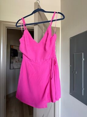 Bright hot pink cami romper with a V-neck. Adjustable spaghetti straps. Defined waist with a relaxed skirt-style bottom. Lightweight fabric for easy wear. Great for casual summer outings.