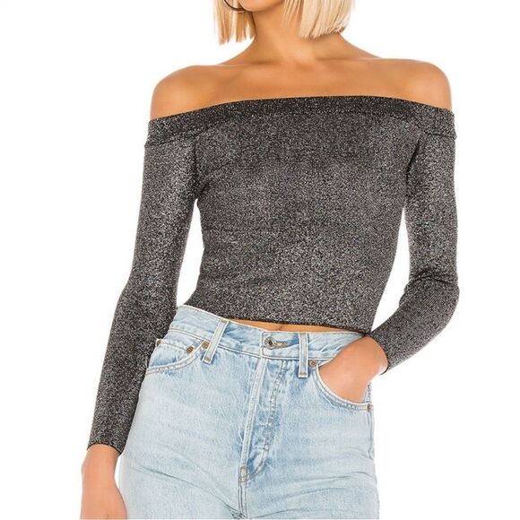 superdown Kemi black/silver glitter shimmer top. Off shoulder long sleeve. NWT. Size XS.
