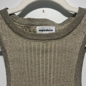 Superdown Sonya Rib Sweater Tank in a gold color. It is a sleeveless, ribbed knit tank top featuring metallic threading throughout the fabric. Elevate your style with this chic gold sleeveless ribbed top. Perfect for any occasion, it offers a comfortable and flattering fit.