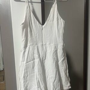 Sleeveless white romper with thin straps. V-neck silhouette and fitted waist. Smooth lightweight fabric with clean finish. Very short fitting