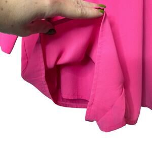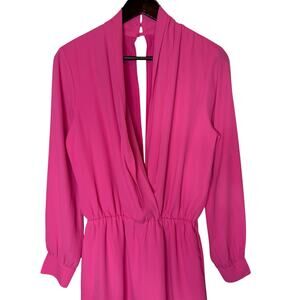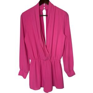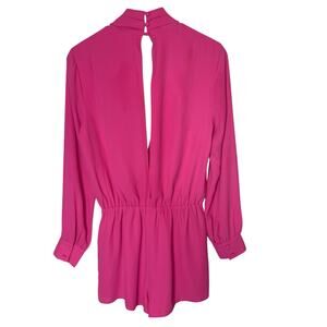 superdown kaycie drape neck romper in hot pink size Medium In excellent condition, no blemishes 100% poly Hand wash cold Pull-on styling Elasticized waist Back keyhole with button closure Buttoned cuffs Imported Made in China Style No. SDRO183 S20 Measurements: 19in underarm to underarm 13.5-21in across waist 1.5in inseam 32.5in shoulder to hem revolve, party, date night