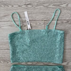 Bra top with mini pencil skirt, there is no gather on skirt.