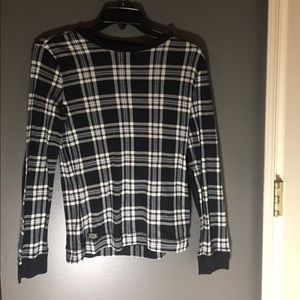 black and white flannel sweater with a zipper on the top of the left shoulder