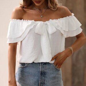 swiss dot boho off shoulder relaxed fit ruffle and tie detail blouse white
