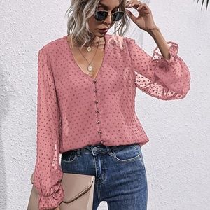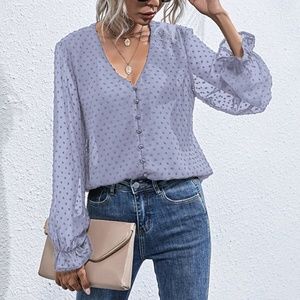 swiss dot v neck button chiffon long sleeve top