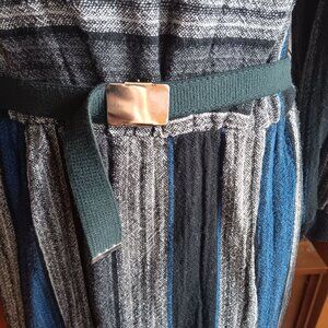 This vintage knit dress combines elegance and comfort, featuring striped patterns, a turtleneck, and a belted waist. Made in the USA for timeless style.