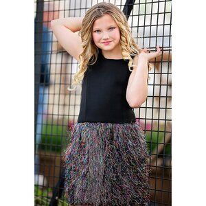*** Offers welcome*** Your tween style diva will love this Zoe Ltd Color War Rainbow Shimmer dress! This stylish special occasion dress features black bodice with gold zipper in back and the sparkly foil skirt shimmers with all imaginable rainbow of colors. Perfect for a glamorous red carpet event or dance party. The shimmery skirt is slightly barrel-shaped and holds shape beautifully due to a crinoline underskirt, in addition to full lining. made in USA of polyester/metallic and spandex combo. Hand wash cold water