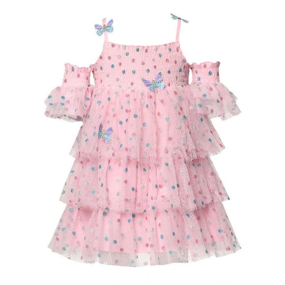it just doesn't get cuter than this fluffy soft tulle creation by Baby Sara. Super sweet butterfly and silver dots adourn this lively tiered ruffle dress.