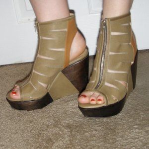 Colorblock Light olive green color with camel color contrast, dark brown wooden wedge platform/heel with olive leather inset