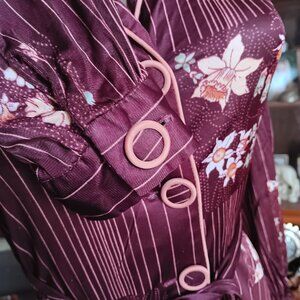 Evoking a bygone era, this vintage dress features a rich burgundy hue adorned with delicate floral patterns and timeless pinstripes. The button-up front and belted waist accentuate its classic silhouette, while the long sleeves and collared neckline add to its charm. A piece of history woven into elegant fabric.