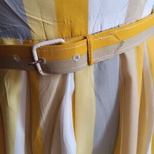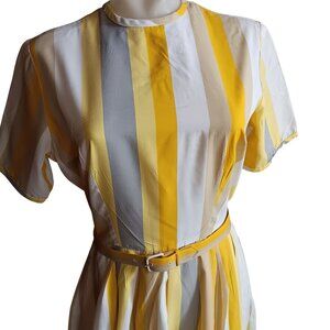This vintage Jane Ann dress features vibrant yellow and white stripes with a flattering belted waist. Its lightweight polyester material ensures comfort and style.
