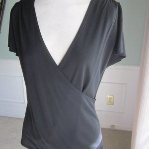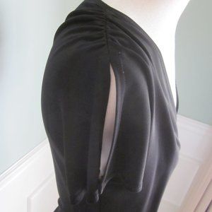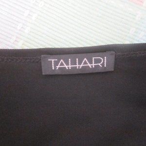 Black cap split sleeve, wrap look dressy top by Tahari. Fabric is 70% vicose, 30% polyester. Great for travel? Excellent condition --- like new!