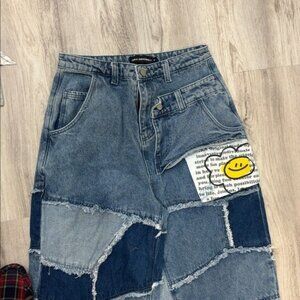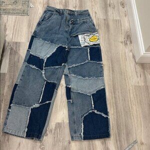 taka original that's fun distressed Patchwork Blue Jeans loose fit size medium Stylish patchwork blue jeans with a unique design. Perfect for a trendy and casual look.