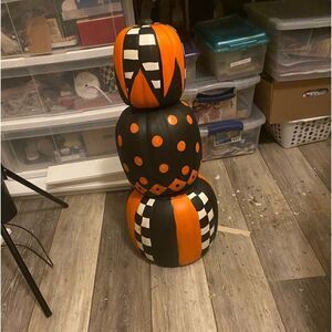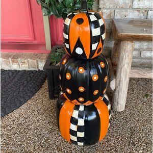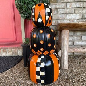 27” tall pumpkin stack, hand painted, designer inspired with a high gloss coating. Great fall decor. This is not Mackenzie Childs