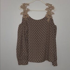 tan and black patterned blouse w 3/4 length sleeves and crochet straps - NWOT