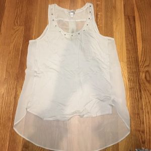 Light blue tank top with stud detailing around the collar. Sheer back.