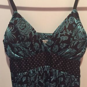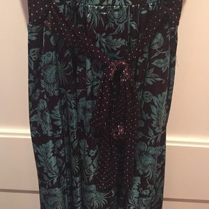 real and brown floral pattern, the tie that starts in the front is brown with small teal polka dots, has a brown lining underneath, padding in the bust