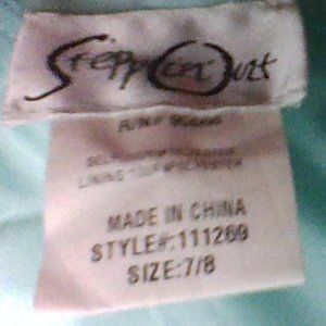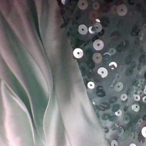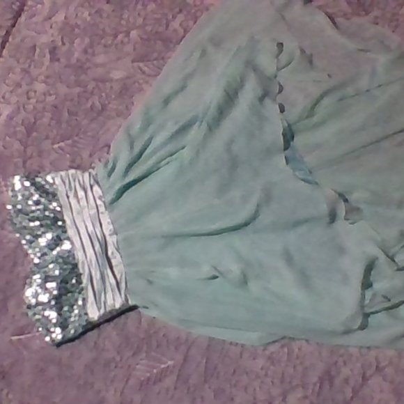 teal strapless dress, is long in the back and shorter in the front and zips up in the back its a size 7/8 brand is in the pictures