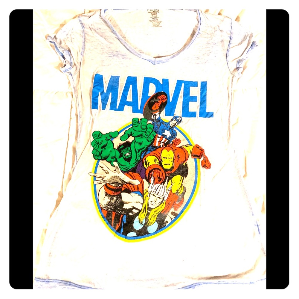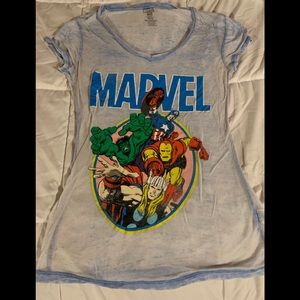 Juniors sheer light blue marvel tee. Fabric is see through.