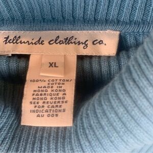 This sweater from Telluride Clothing Company is perfect for casual occasions. The blue color and ribbed pattern give it a natural and outdoor feel, while the turtleneck and long sleeves provide warmth and comfort. Made of 100% cotton, this sweater is soft and knit, with a fabric type of knit. The sweater is a size XL, with a regular size type, and is designed for women. The style is a pullover, making it easy to wear and layer. The sweater is perfect for those who love nature and the outdoors, and is a classic piece that will never go out of style.