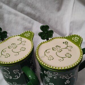 Set of 2, Temptations Green Floral Lace pattern Shamrock cafe mugs with lids/coaster/plate and spoons